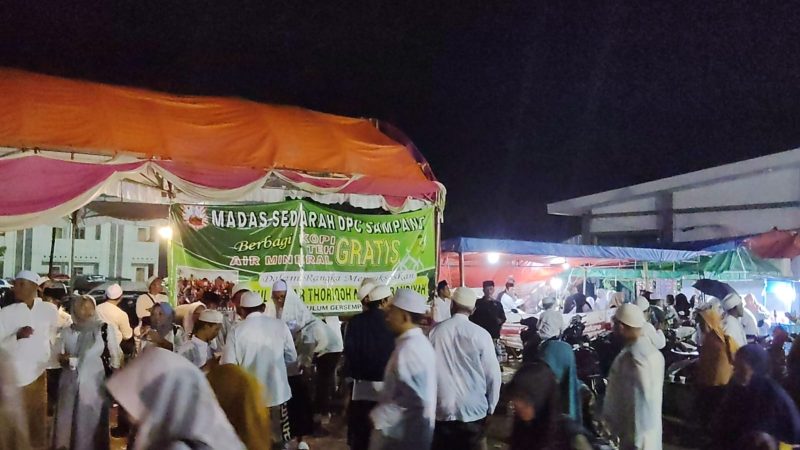 Gratis.SAMPANG, // Detikdki.online Dewan Pengurus Cabang Madas Sedarah Ngalap Barokah Sambut kedatangan Alumni Pondok Pesantren Darul Ulum Dan Jamaah Toriqoh Naqsyabandiyah Ahmadiyah Mudheriyah dengan Air ,Teh dan Kopi Gratis. Program ini didukung langsung oleh ketua umum Madas Sedarah Bung Taufik yang merupakan alumni Pondok Pesantren Darul Ulum Gersempal Omben Sampang. untuk mensukseskan haul yang ke 36 Guru Mursyid Toriqoh KH.Abdul Wahid Bin Khudaifah dan Harlah yang Ke 25 Ikatan Santri Alumni Darul Ulum ( IS’AD )